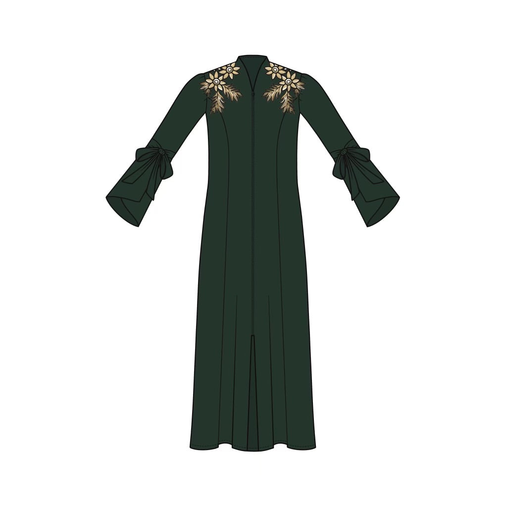 Made from smooth satin stretch fabric, it features a front zipper for quick and easy wear. The circular flounce sleeves with adjustable ties add a refined touch, allowing for a personalized fit. With convenient pockets and a true-to-shirt size design. Decorated with two golden beaded applications at the top. The sizing is between the Brown toga and the classic togas. Not as tight as brown toga but not as loose fitting. True to shirt size XS to 2XL. The hem is premade to fit women between 5'2" to 5'9". We do not alter any hems