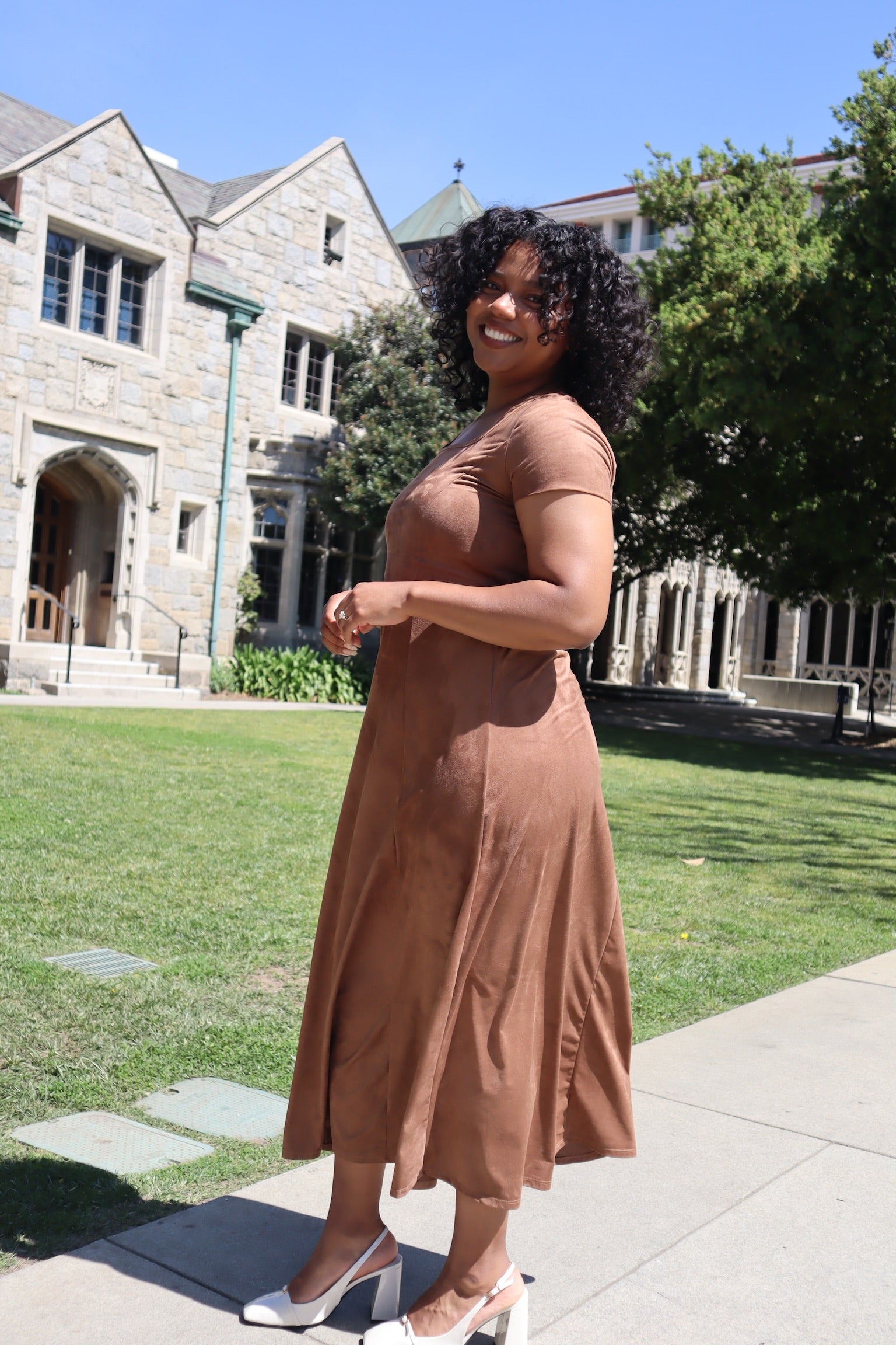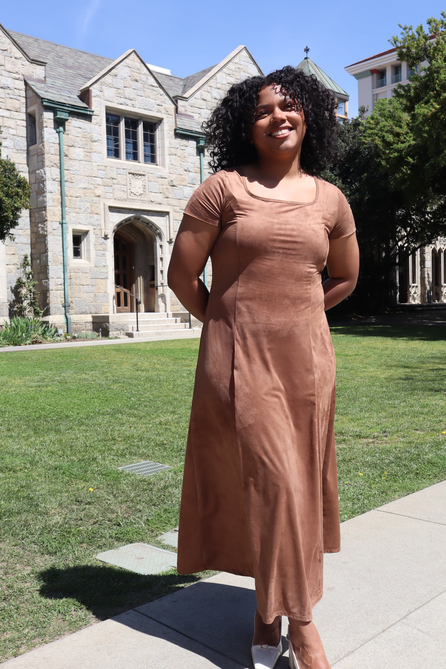 This princess-cut maxi dress is designed with a structured bodice and a flowing skirt. Made from suede material, it provides a combination of texture and comfort. Unlike dresses with a defined waistline, the princess cut provides a continuous, vertical line from the shoulders to the hem. This creates a lengthening effect. Features an adjustable waist tie at the back. This allows for a customized fit at the waist.