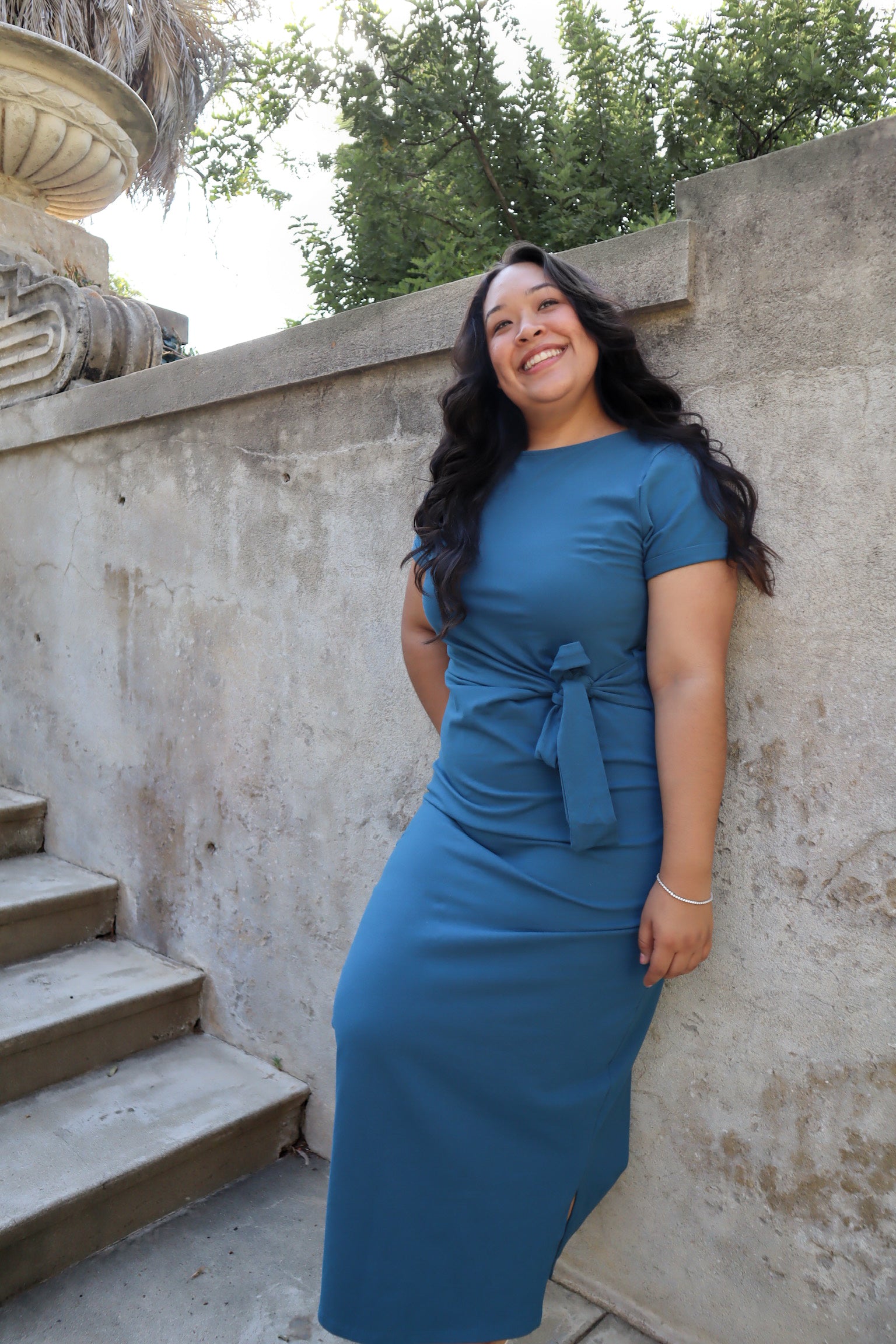 An R. Tailors' exclusive: T-shirt dress, designed for effortless comfort and versatility. This dress features a decorative and functional side tie that cinches the waist, giving you a flattering silhouette. The stretchy fabric ensures a perfect fit without the need for a zipper, while two 7-inch side slits add a touch of elegance and ease of movement. We've crafted this dress in a straight-cut style and curated flattering fabrics. Perfect for any casual occasion, this dress combines relaxed vibes with a sophisticated twist.