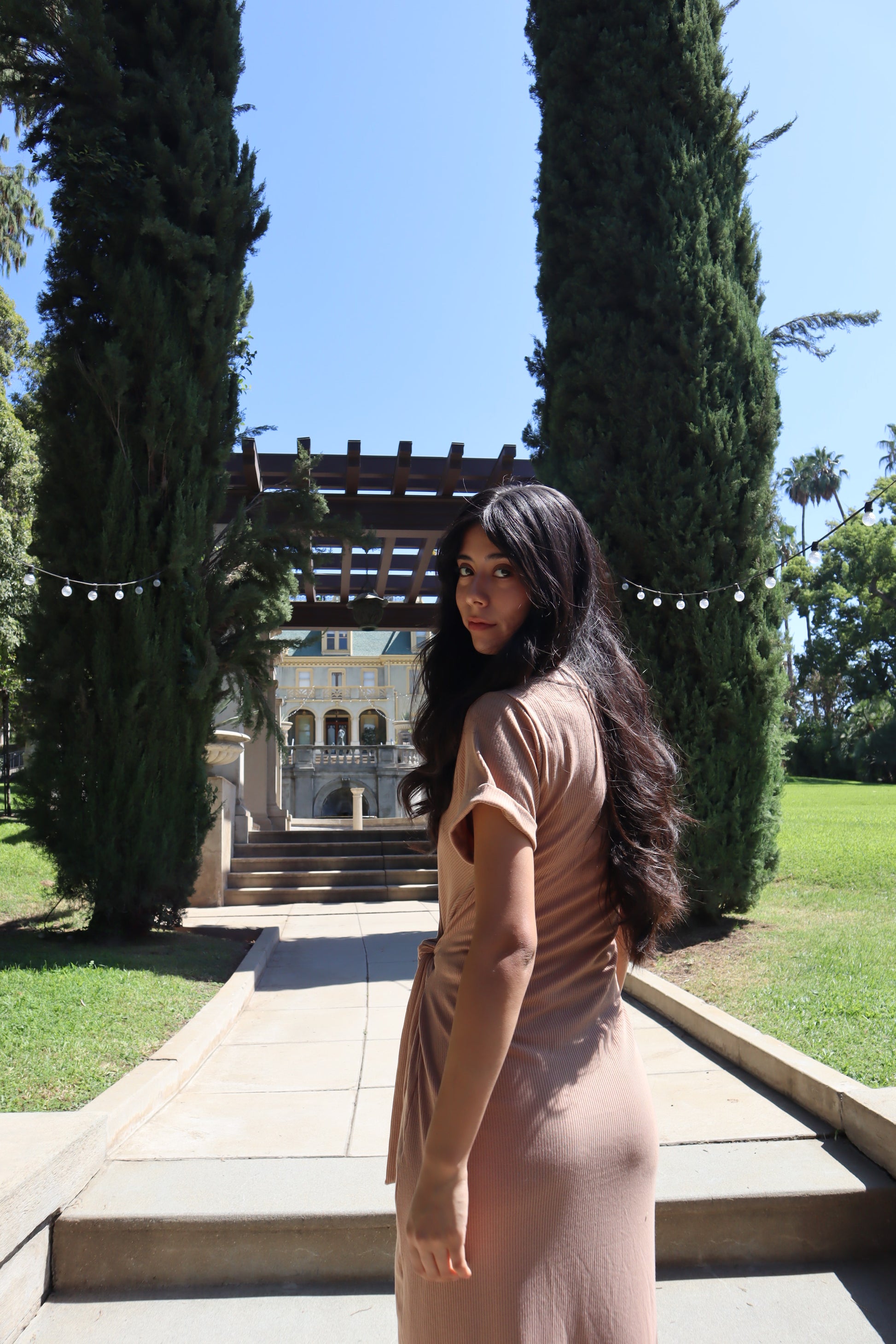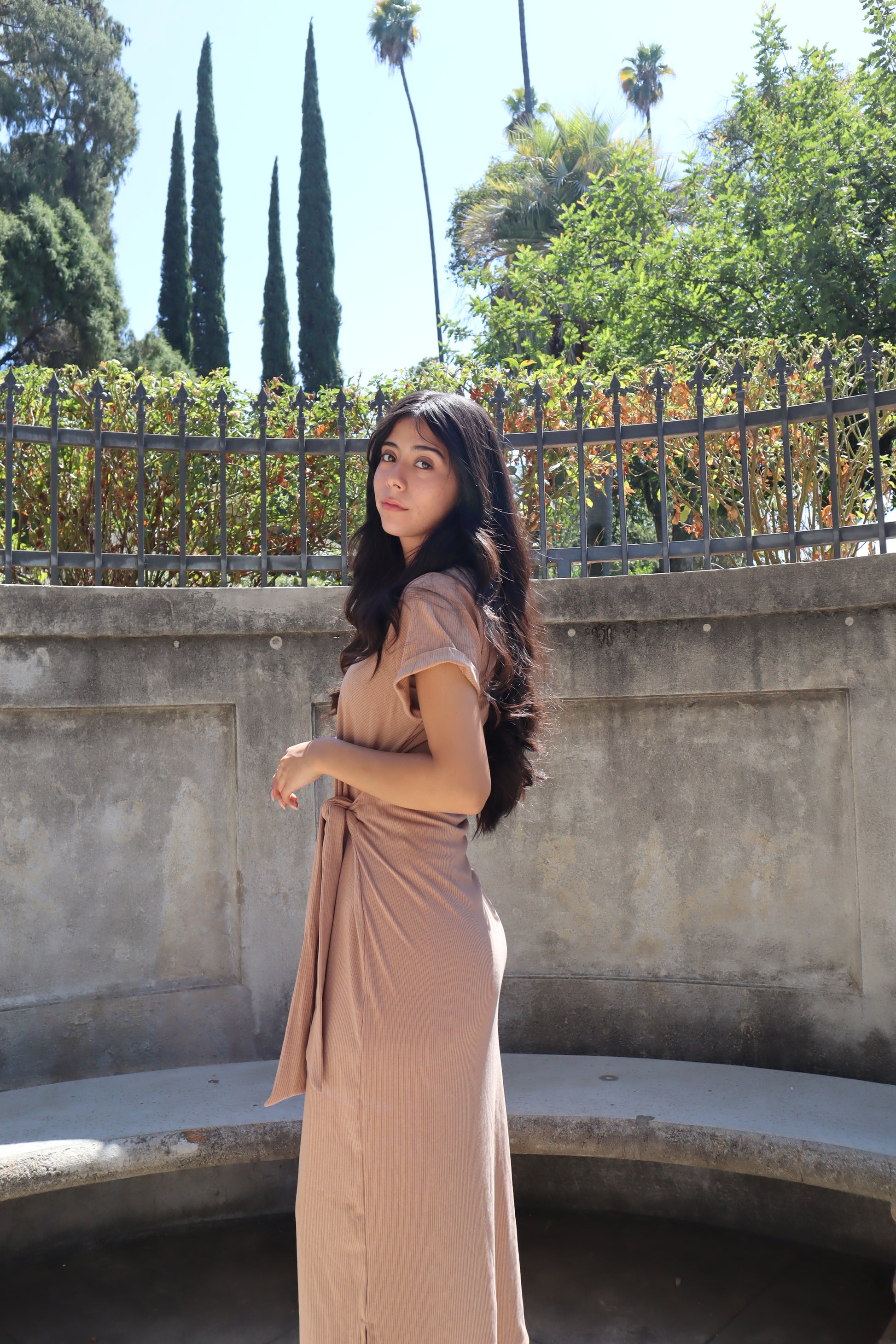 An R. Tailors' exclusive: T-shirt dress, designed for effortless comfort and versatility. This dress features a decorative and functional side tie that cinches the waist, giving you a flattering silhouette. The stretchy fabric ensures a perfect fit without the need for a zipper, while two 7-inch side slits add a touch of elegance and ease of movement. We've crafted this dress in a straight-cut style and curated flattering fabrics. Perfect for any casual occasion, this dress combines relaxed vibes with a sophisticated twist.